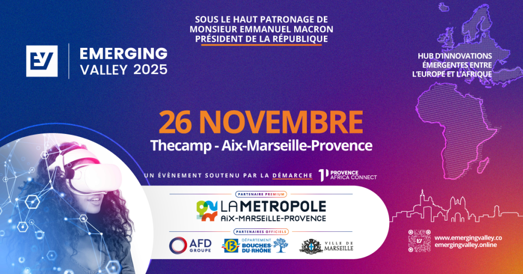 Le 26 novembre 2025, EMERGING Valley revient à Marseille pour sa 9ᵉ édition. Un rendez-vous essentiel pour toutes celles et ceux qui souhaitent suivre, comprendre et rejoindre les dynamiques d’innovation entre l’Europe, l’Afrique et la Méditerranée.